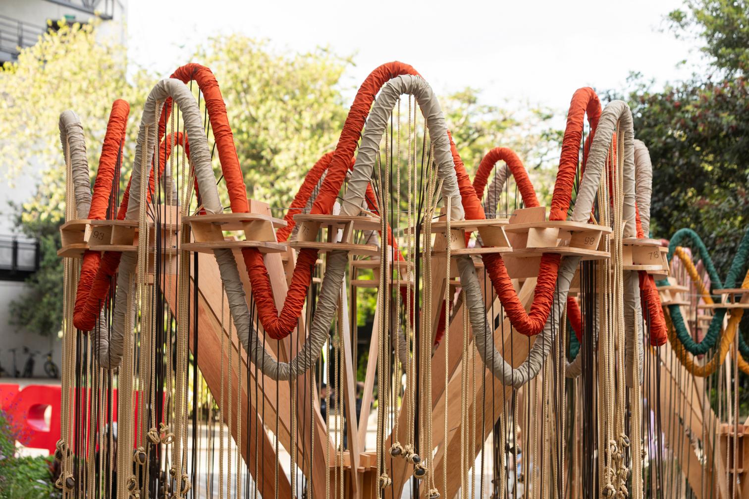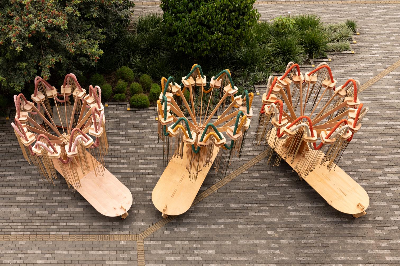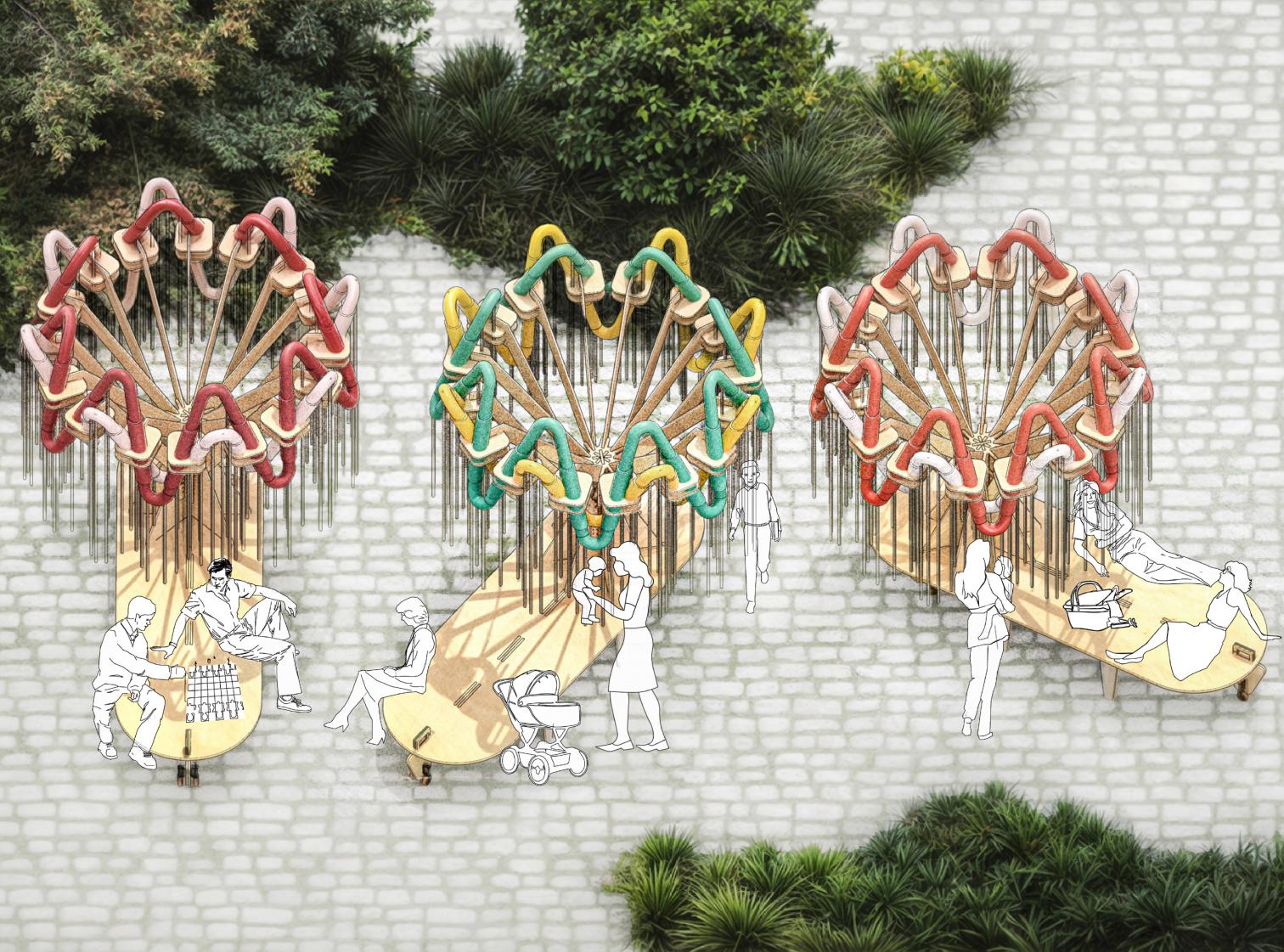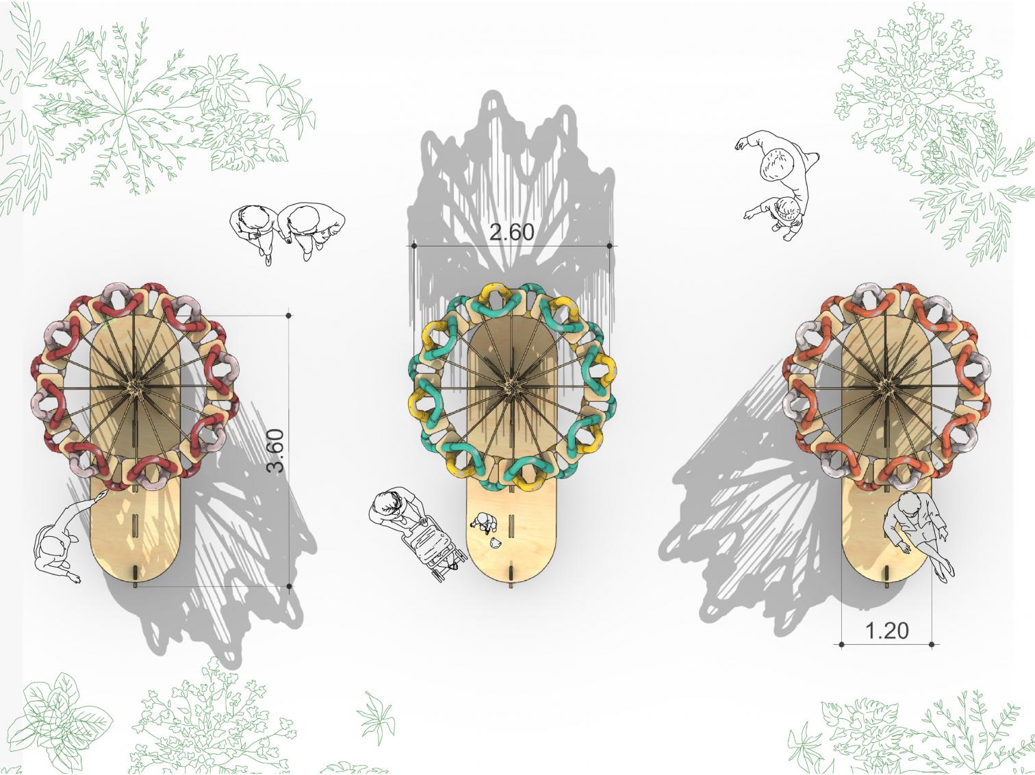 La ‘copa arbórea’ está inspirada en los tentetiesos, que otorga estabilidad dinámica. Se compone de doce ramas de entre 1,20 y 1,50 m, arriostradas con cables de acero inoxidable de 3 mm. En el extremo de cada rama se insertan dos bandejas que alojan tubos revestidos con tejido de exterior. A ellos se cosen cuerdas de fibra orgánica cada 15 cm, lastradas con piedras de río de 200–300 g, que filtran la radiación solar con inclinaciones menores de 30°.