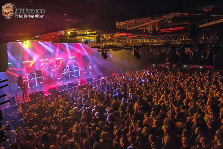 Era una noche especial, tanto para la banda como para sus seguidores. Así que la bienvenida que les tributó el público barcelonés estuvo a la altura, vitoreándoles y agasajándoles desde que aparecieron en escena acompañados de una introducción para acto seguido abalanzarse sobre el implacable y devastador “Clockwork”, que nos daba la primera ración de velocidad y riffs afilados para que empezáramos a calentar las cervicales. La conexión entre banda y público, -como siempre que tocan por aquí-, fue instantánea; con la gente completamente desatada mientras sobre el escenario el headbanging era continuo e implacable.