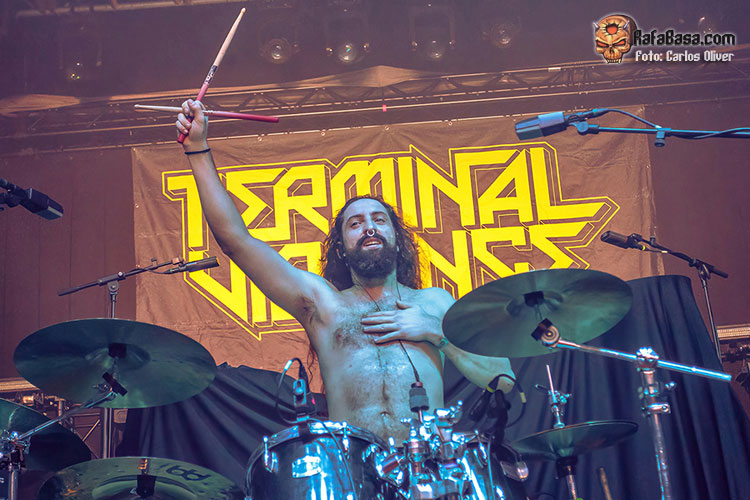 TERMINAL VIOLENCE habían conseguido mover al personal, revolucionar el cotarro. Así que les quedaba rematar su descarga por todo lo alto y para ello, evidentemente, no tenían intención de cambiar. De modo que mejor que seguir thrasheando con una nueva sesión de “zapatilla”, dándonos argumentos para agitar la cabeza y levantar los puños mientras acompañábamos los vertiginosos fraseos de “All Hail Zyon”. La puntilla para la intensa, humeante y seminal descarga que nos brindaron TERMINAL VIOLENCE corrió por cuenta de un nuevo guiño al material de lo que fue su EP de presentación “Warhole”: “Riddle Of A Nightmare”, tras el que se marcharon dejando el ambiente por todo lo alto y perfectamente caldeado de cara a lo que iba a ser el plato fuerte de la noche.