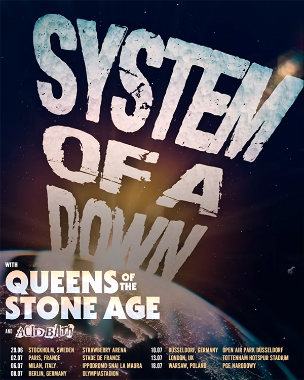 El mes pasado System of a Down anunció que llegará al continente europeo con siete fechas de conciertos que han confirmado para el próximo verano de 2026, en los que estarán acompañados por Queens of the Stone Age y Acid Bath. Lamentablemente, España, de momento, no se encuentra entre los países que se visitarán en esta ocasión.