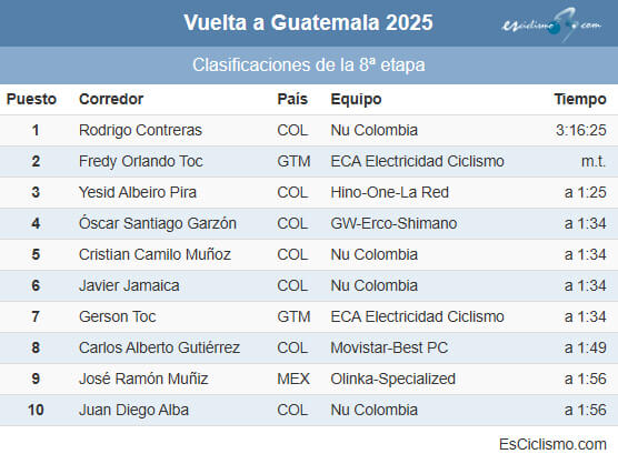 Éstas son las clasificaciones completas tras la 8ª etapa de la Vuelta a Guatemala 2025, una exigente jornada de montaña disputada este viernes, 31 de octubre, entre San Juan La Laguna y Patzún sobre un recorrido final de 119,8 kilómetros y más de 2.800 metros de desnivel acumulado.