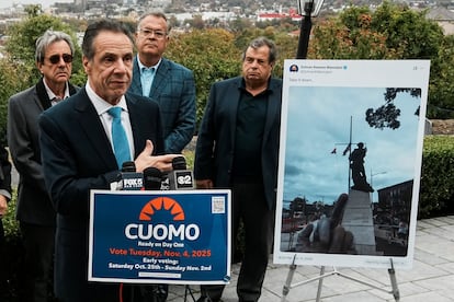 Andrew Cuomo muestra el miércoles pasado en un acto electoral una foto extraída de la cuenta de Twitter de Mamdani de una protesta contra una estatua de Colón en Staten Island, en 2020.Eduardo Munoz (REUTERS)