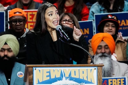 La congresista Alexandria Ocasio-Cortez, el domingo pasado en un mitin de apoyo a la candidatura de Mamdani.Eduardo Munoz (REUTERS)