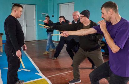 Ucranios asisten a un entrenamiento de lucha con cuchillos para civiles organizado por el Centro de Entrenamiento de Ciudadanos para la Resistencia Nacional en Járkov, al noreste de Ucrania, este sábado.