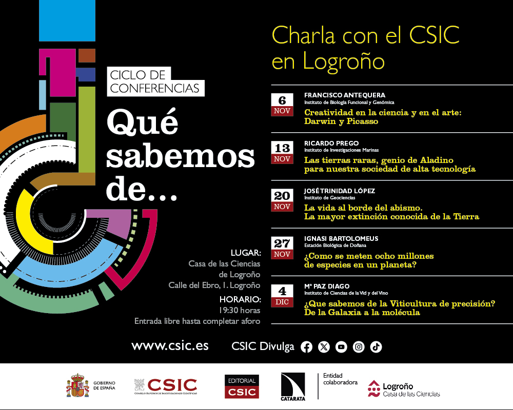 Valladolid y Burgos, en Castilla y León, y Logroño acogerán nuevos ciclos de conferencias ‘¿Qué sabemos de?’ durante los meses de noviembre, diciembre y febrero. La inteligencia artificial, la mecánica cuántica, los elementos químicos, la creatividad en la ciencia, las tierras raras o la viticultura son algunos de los temas se abordarán en las charlas, que pretenden construir un entorno de diálogo entre la sociedad y especialistas del Consejo Superior de Investigaciones Científicas (CSIC).