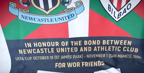 Pero no solo en la capital vizcaína dejó un enorme poso esa ronda de la antigua segunda competición europea. Los aficionados de las ‘urracas’ terminaron enamorados de Bilbao, hasta el punto de que en los encuentros que se disputan en St. James Park se puede observar una ikurriña con los escudos del Newcastle y el Athletic. Debajo una inscripción en inglés. «En honor al vínculo entre el Newcastle y el Athletic. Copa de la UEFA. 18 de octubre, St. James Park, 1 de noviembre, San Mamés. Para nuestros amigos».