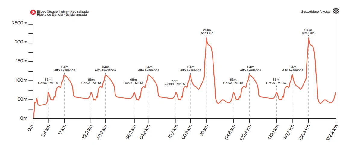 La meta estará situada, como es habitual, en el exigente Muro de Arkotxa, que los corredores deberán afrontar en siete ocasiones, siendo la última decisiva para la lucha por la victoria. Además, el pelotón tendrá que superar en dos ocasiones la icónica subida a Pike Bidea, entre Sondika y Bilbao, un tramo característico del Circuito de Getxo y que también formó parte del recorrido del Tour de Francia 2023.