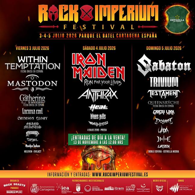 Salvo que se produzcan incorporaciones de última hora, el cartel de la quinta edición del Rock Imperium se completa con los previamente confirmados Sabaton, Trivium, Lacuna Coil, H.E.A.T. Queensrÿche, The Gathering, Hagane, Crimson Glory, Dogma y Triskel.