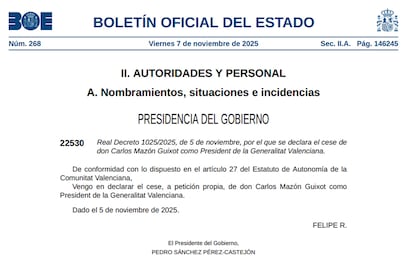 Anuncio del cese de Carlos Mazón publicado en el BOE el 7 de noviembre de 2025.