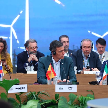 El presidente del Gobierno, Pedro Sánchez (c), asiste a la 30 Conferencia de las Naciones Unidas sobre el Cambio Climático de 2025 (COP30) en Belém, a 7 de noviembre de 2025, en Belém, Pará (Brasil). La cumbre anual, organizada por Naciones Unidas, reúne a líderes mundiales, científicos, organizaciones no gubernamentales y otros actores para debatir los esfuerzos globales contra el cambio climático.