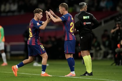 Dani Olmo entra en el campo como reemplazo de Fermín López, quien parece haberle adelantado en la rotación del Barça.Enric Fontcuberta (EFE)