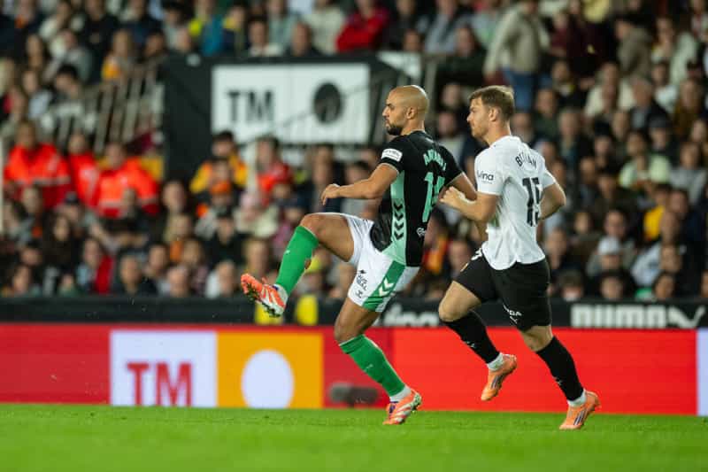 Natan de Souza, seguramente el más entonado de los cuatro centrales del Real Betis, vio en Mestalla una cuarta amarilla del ciclo que le hace estar apercibido a las puertas de El Gran Derbi del próximo 30 de noviembre en el Ramón Sánchez-Pizjuán, que se perdería en caso de ver otra tarjeta a la vuelta del parón de selecciones que arranca este lunes contra el Girona FC, encuentro fijado a las 16:15 horas del próximo domingo 23-N. Por su parte, los otros dos componentes del plantel verdiblanco que llegaban a la jornada 12ª con tres amonestaciones, Giovani Lo Celso y Sofyan Amrabat, se marcharon sin ver ninguna. El rosarino anduvo lejos, aunque protestó airadamente tanto el empujón dentro del área local que le propinó Thierry Correia y no fue castigado con penalti por García Verdura como un agarrón clarísimo fuera en el que el colegiado catalán dio ventaja.