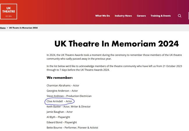 Su muerte ha pasado completamente desapercibida en los medios españoles hasta ahora. Es la web oficial de UK Theatre, la organización que representa a los teatros y las artes escénicas en todo el Reino Unido, la que confirma la noticia. El nombre de Clive Arrindel aparece entre los recordados In Memoriam en la ceremonia de 2024. También el Old Augustinians College, centro donde estudió Arrindell, incluyó su nombre en la misa anual de conmemoración celebrada el 9 de noviembre de 2024 en Ramsgate, Inglaterra.