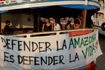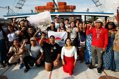 Miembros de la flotilla Yaku Mama proveniente de Ecuador, en Belém, el 9 de noviembre.Antonio Lacerda (EFE)