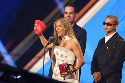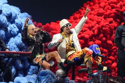 Y luego llegaron la gran revelación que son los argentinos Ca7riel y Paco Amoroso, que se llevaron cinco galardones, aunque todos en la pregala: mejor vídeo musical versión corta y versión larga, mejor álbum de música alternativa por Papota, mejor canción alternativa por #tetas y mejor canción pop por El día del amigo. Triunfaron en Coachella y siguen arrasando allá por donde van. En Las Vegas lo hicieron con una mezcla de temas, El impostor, #Tetas y La que puede, puede, El día del amigo… y cuatro muchachos musculosísimos en calzones cosiendo cojines que lanzaban al público. En la sala de prensa, en su tono de broma habitual, aseguraban a EL PAIS que iban a fundir sus cinco Grammy para hacerse una cadena.