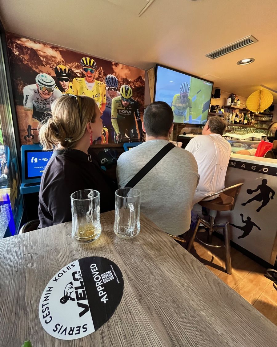 En el bar se comenta la jugada, se mira lo que sucede… pero no es hasta muy al final, cuando Pogačar logra descolgar a Vingegaard en el último tramo del Col de la Loze, que se oyen voces y aplausos en el bar, celebrando el tiempo que su líder le está sacando al danés.