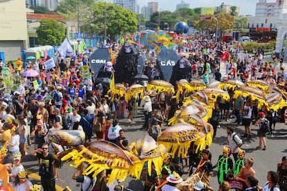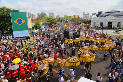 Entre cantos, bailes y murmullos, llegaron tres tumbas negras, de entre cinco y siete metros de altura, a los exteriores del nuevo Mercado de São Brasil, en Belém. No faltaron las viudas a su alrededor, pero los asistentes no las esperaban con tristeza, sino más bien con la esperanza de que este funeral simbólico se convirtiera en una realidad. Cada caja tenía un nombre: Gas, Coal (carbón) y Oil (petróleo). Delante de las estructuras gigantes, una boa, sostenida por una decena de personas, zigzagueaba de un lado al otro y, custodiándola, una fila de más de 80 jaguares se imponía en las calles de la ciudad amazónica.