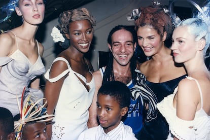 John Galliano, con algunas de las modelos del desfile de su colección p-v 1996, entre ellas Naomi Campbell, Helena Christensen y Kate Moss.Pool ARNAL/PAT (Gamma-Rapho via Getty Images)