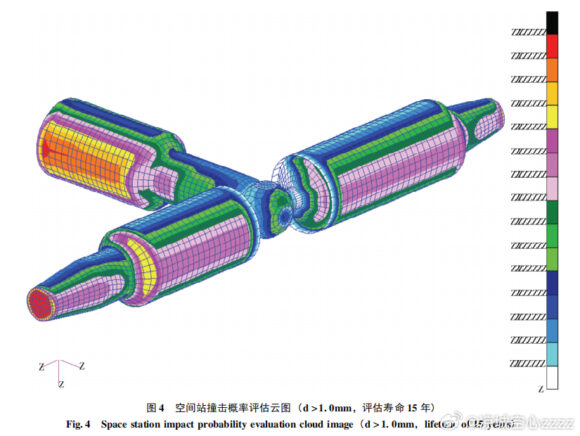 Estudio de la probabilidad de impacto de basura espacial en la estación. Los laterales, como donde estaba situada la Shenzhou 20, son una de las zonas de mayor riesgo (Weibo).
