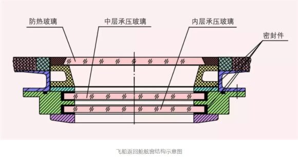Sección de una de las ventanas de la cápsula Shenzhou. Arriba el panel exterior resistente a la temperatura. Abajo, los dos paneles de vidrio internos que permiten la presurización (Weibo).