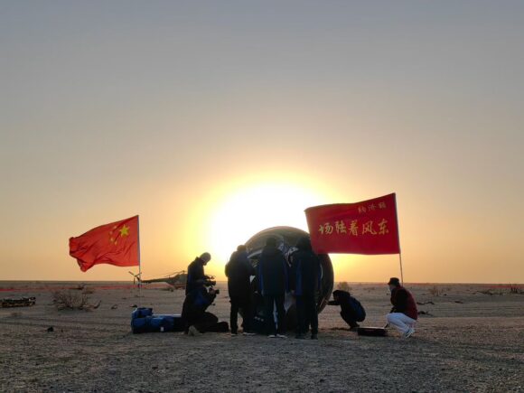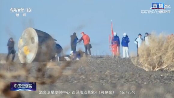 La cápsula de la Shenzhou 20 en tierra con la tripulación de la Shenzhou 21 (CMS).