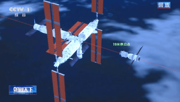 Acoplamiento de la Shenzhou 21 en el puerto frontal del Tianhe. La Shenzhou 20 estaba acoplada al nadir (CCTV).