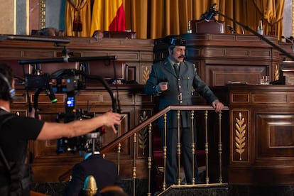 A Manuel Solo le pareció especialmente emocionante resaltar la lealtad que, a pasar del precio a pagar, Gutiérrez Mellado demostró hasta el final por Suárez. “Por un lado paternal, se esmeró en cuidarlo y a la vez, como militar, acataba todas sus órdenes”. Morte ha sido consciente del riesgo que asumía. El empeño en conseguir el papel de Suárez podía ser un regalo envenenado para el protagonista de La casa de papel. ¿Una oportunidad o un marrón? Visto el resultado, su brillante y más que convincente actuación, su orgánica simbiosis con el personaje, se decanta agradecido por lo primero. Una oportunidad bien aprovechada. “Tiene muchísimas capas, muchas caras. Como actor me interesaba realzar a la persona detrás del político”, asegura Morte. Sobre todo, comenta, para que lo entienda la gente más joven: “Un público en el que hemos pensado muchas veces al rodar la serie. Ya otros no tan jóvenes, también —yo, por ejemplo, que tengo 50 años— no recordamos haber estudiado nunca este episodio en el colegio”.