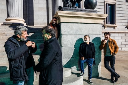 También algún día de rodaje intenso en el Congreso de los Diputados, ese lugar frente al que posan en una mañana de noviembre, ya devueltos a su propio ser. Lo lograron bajo la condición de que si se convocaba un pleno extraordinario —y con la situación política actual, podría ocurrir en cualquier momento— debían desmontar todo en tres horas.