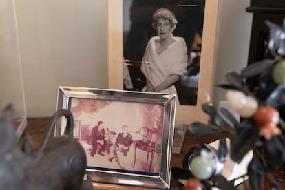 Retrato de la reina Victoria Eugenia, abuela de Juan Carlos I. En otro portarretrato, fotografía de Peñafiel entrevistando a la esposa de Alfonso XIII, en Suiza, en 1969, días antes de su muerte.