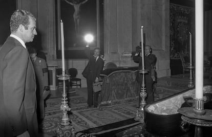 La estampa ha sido tétrica. Tras la misa, los príncipes se desplazan al Palacio de la Zarzuela. Juan Carlos debe revisar la agenda del viernes, se desplazará en varias ocasiones al aeropuerto para recibir a personalidades de todo el mundo que asistirán el sábado a su proclamación como Rey y al entierro. Revisa en voz alta el discurso que la Corona dirigirá a la nación y que leerá una vez haya sido proclamado Juan Carlos I. Las versiones sucesivas las ha ido actualizando el diplomático Joaquín Puig de la Bellacasa, su secretario. Debe ser lo suficientemente ambiguo para que no incomode demasiado a los unos y a los otros. La clave es una frase que deja el futuro abierto: “Hoy comienza una nueva etapa en la historia de España”. La vieja empieza definitivamente a desaparecer a las 8 de la mañana del viernes, cuando se abre la capilla ardiente en el Salón de Columnas del Palacio Real y decenas de miles de españoles se despiden del dictador. Es el principio del fin.