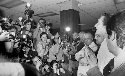 Los doctores Cristóbal Martínez-Bordiú, marqués de Villaverde, y el doctor Castro Fariñas ofrecen declaraciones a los periodistas en el vestíbulo de la Residencia Sanitaria La Paz, el 12 de noviembre de 1975.EFE