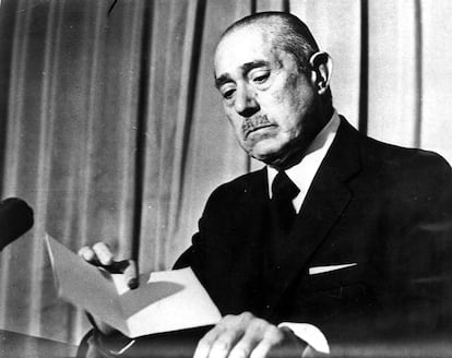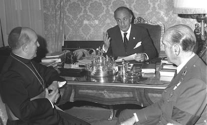 Los asistentes a la primera misa corpore insepulto han ido llegando a la capilla real de El Pardo. El féretro está colocado sobre un tapiz junto al sable, las condecoraciones y otros atributos de la Jefatura del Estado. La ceremonia es para la familia, autoridades civiles y militares y los príncipes, que a primera hora ya se habían acercado al palacio para dar el pésame a Carmen Polo. Al exministro Gonzalo Fernández de la Mora, que se presenta con su mujer, no le dejan pasar. El funeral lo oficia el obispo Vicente Enrique y Tarancón, 68 años, presidente de la Conferencia Episcopal, que había sido reelegido en marzo para ejercer ese cargo. “No esperéis de mis palabras ni un juicio histórico ni tampoco un elogio fúnebre”.