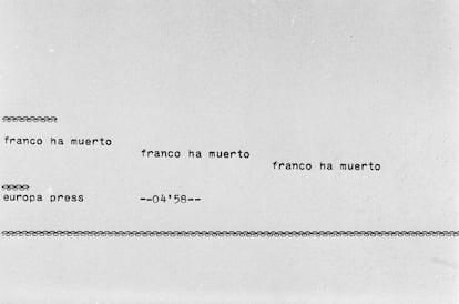 Teletipo de la agencia Europa Press que anuncia la muerte del dictador, escrito tres veces por el periodista Marcelino Martín.Europa Press