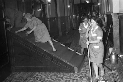 Hay tristeza en el Congreso, pero el grupo de electricistas y carpinteros retoma su trabajo. No tienen mucho tiempo para rediseñar el Hemiciclo. En el lugar de la tribuna de oradores y la Mesa debe habilitarse el faldistorio, la mesa de la jura y el espacio que ocupará el consejo de regencia y la Familia Real. En el centro se colocarán dos sillones de Patrimonio Nacional para Juan Carlos y Sofía. También una mesilla para los dos objetos simbólicos conservados hasta la tarde del viernes en el Palacio de Oriente: la corona, encargada por Carlos III, y el cetro de plata. El ejemplar de los Evangelios sobre el que jurará Juan Carlos pertenece a las Cortes: está fechado en 1829 y sobre él juraron la Regente doña María Cristina, Alfonso XIII y hace seis años el propio Juan Carlos cuando fue designado por Franco como su sucesor.