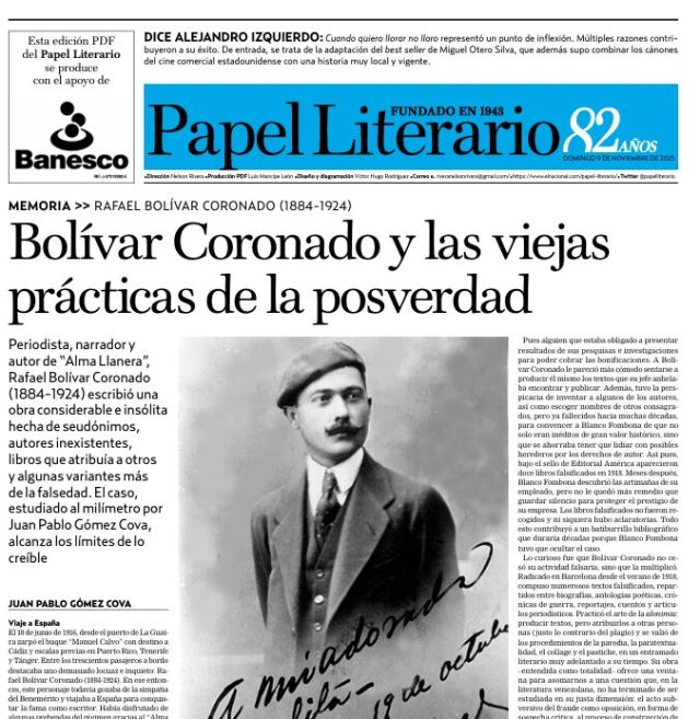 Periodista, narrador y autor del “Alma Llanera”, Rafael Bolívar Coronado (1884-1924) escribió una obra considerable e insólita hecha de seudónimos, autores inexistentes, libros que atribuía a otros y algunas variantes más de la falsedad. El caso, estudiado al milímetro por Juan Pablo Gómez Cova, alcanza los límites de lo creíble. Este, y otros temas, en el Papel Literario del diario El Nacional. Disfruten su lectura:Bolívar Coronado y las viejas prácticas de la posverdad