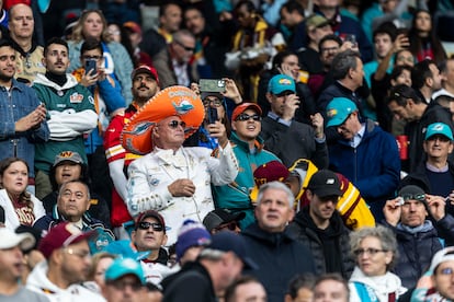 El juego, como era de esperar, era lo de menos en el Paseo de la Castellana. Lo novedoso recaía en todo lo que lo rodeaba, empezando por el torrente de estímulos que se agolpaba en los exteriores del estadio, donde las fotos, la música y la cerveza daban colorido a las interminables colas que conducían al férreo anillo de seguridad que blindaba el feudo del Real Madrid, mucho más restrictivo que en cualquier domingo liguero. Dentro, el imponente aspecto del Bernabéu, engalanado desde hace días para la ocasión, desencajaba la mandíbula a propios y extraños antes de dar paso al choque entre Dolphins y Commanders, la excusa deportiva con la que justificar el desembarco norteamericano en la capital.