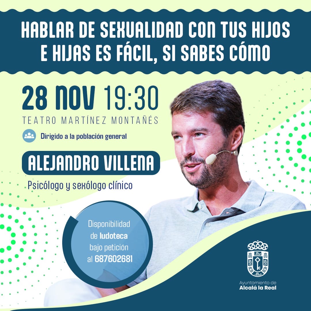 El acto central correrá a cargo de Alejandro Villena, psicólogo general sanitario y sexólogo clínico, que el 28 de noviembre abordará el impacto del consumo de pornografía en la adolescencia con dos charlas, una dirigida al alumnado “Diez razones para rechazar la pornografía”, a las 12h, y otra para familias y población general, “Hablar de sexualidad con tu hijo e hija es fácil, si sabes cómo” a las 19:30h. Ambos encuentros tendrán lugar en el Teatro Martínez Montañés, con servicio gratuito de ludoteca previa reserva en el teléfono 687-60 26 81.