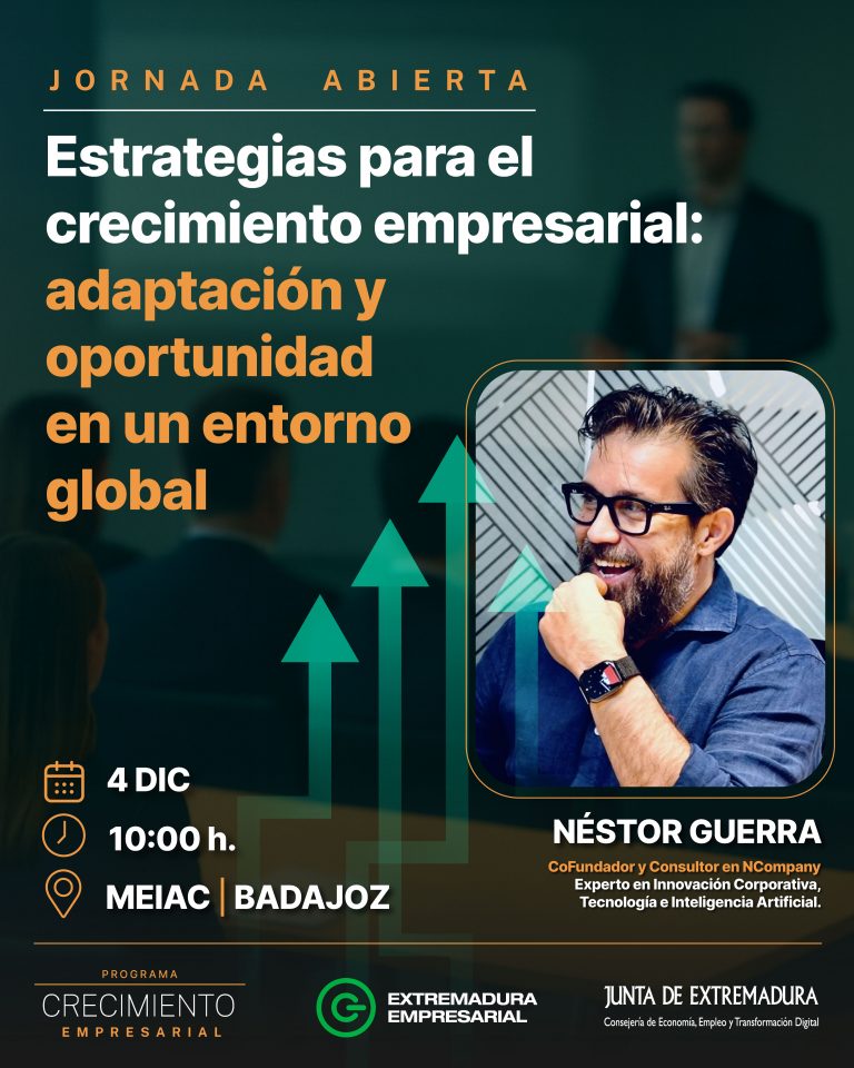 El próximo 4 de diciembre en el MEIAC de Badajoz tendrá lugar la jornada “Estrategias para el crecimiento empresarial: adaptación y oportunidad en un entorno global”, una actividad dirigida a empresas y profesionales que deseen analizar enfoques actuales para afrontar los retos económicos y organizativos de los próximos años.