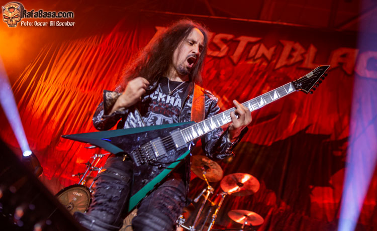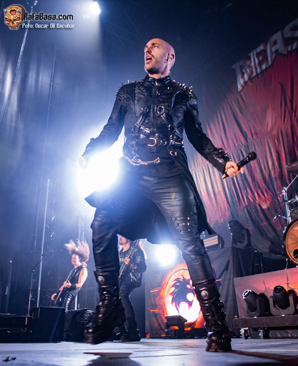 Una intro nos condujo hacia «Power of the Beast» que como single aislado funcionó muy bien, y como inicio del show fue todo un acierto. El sonido desde donde yo me ubicaba era potentísimo en cuanto a volumen, y muy notable la ecualización del mismo, que acompañaba a una puesta en escena enérgica, y a una banda de la que destaco una estética muy encuerada, cuidada…¡muy heavy!. Por supuesto que su propuesta incluye una gran cantidad de pistas grabadas para los cientos de capas de música electrónica que podemos escuchar en cada una de sus canciones, pero es parte de su propuesta, y a mí en cuestión no es algo que me parezca desorbitado teniendo en cuenta que bandas como RHAPSODY ya lo han hecho muchos años atrás, aunque de otro modo y con un teclista en escena. Con un tres cuartos y en una forma física excelente, Yannis Papadopoulos sale a morder, con una voz increíble que navega entre un timbre rasgado y agudos inalcanzables, con una destreza de alucine, mientras que la banda se tiene muy aprendido el dónde tienen que estar en el escenario en cada instante…el boss Anton Kabanen tiene muchas tablas, pero no os perdáis al equipo que forman Máté Molnár al bajo y Atte Palokangas a la batería, que, aún con un sonido muy prcesado, no veáis cómo le pega y lo suelto que se le ve tras el kit. ¿Para todo el mundo?… pues no lo sé, como con cualquier banda, pero lo que está claro es que el fuese a ver a BEAST IN BLACK gustándole, iba a gozar cosa mala, porque habían empezado por todo lo alto.