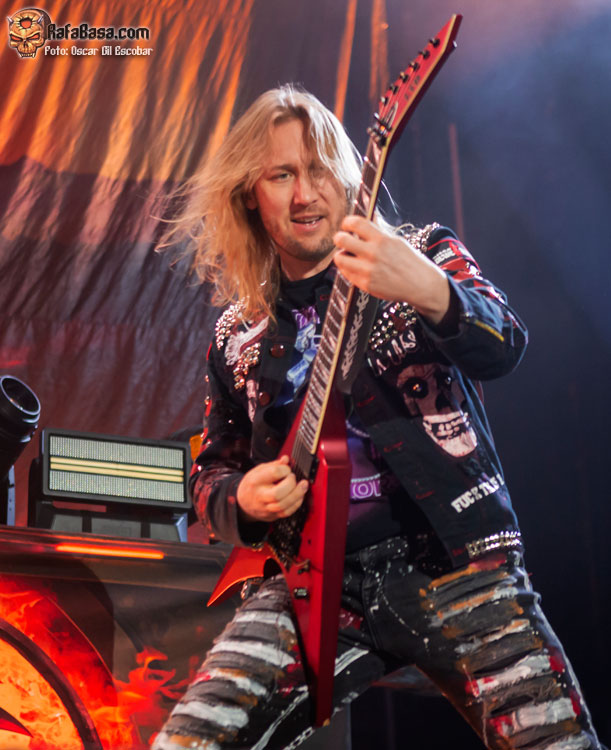 Se hizo larguísima la espera desde que terminaron los finlandeses, hasta que las canciones que se iban sucediendo en el hilo desapareciesen, mientras observábamos el inmenso telón con el logo de HELLOWEEN que cubría el escenario. Unos láser apuntan al escenario y cae el telón de forma espectacular mientras una cortina de chispas intermitentes hace que lluevan chispas sobre la primera línea del escenario… ¡emoción a flor de piel escribiendo esto!. Varias barras de luz, una tarima cubierta de pantallas, y otra pantalla gigante tras la inmensa batería en cuyos parches lucen las clásicas calabazas componen el atrezo de esta noche. Hay otros dos plasmas pequeños laterales, numerosos robots móviles, fluorescentes, focos, y las dos pantallas laterales… desde luego, íbamos servidos de efectos. Cuando una calabaza partida por la mitad se abre en pantalla, tras las montañas del fondo de «Keeper of the Seven Keys» van recordándonos todas sus eras mostrando las portadas de toda su discografía, mientras los músicos, uno a uno, van haciendo acto de presencia… todos ansiábamos que las imágenes de los álbumes, que iban sucediéndose en orden cronológico, llegasen a su último «Giants & Monsters», que sería el tiro al aire de inicio. Nos pusimos muy nerviosos, las uñas cada vez estaban más mordidas y se notaba mucha tensión positiva en el aire… ¡zasca! Cambia el vídeo de repente y empieza a sonar nada más y nada menos que «March of Time», ya con un sonido súper contundente desde el inicio, provocando un subidón de adrenalina impresionante y un efecto en el público emocionadísimo que no dejaba escuchar a la banda, dejando una sensación indescriptible para la retina, el oído y el corazón de todos los que adoran estas maravillosas e inmortales canciones. La calabaza que luce tras ellos con engranajes ya nos avisa…¡el motor está en marcha!. Cada vez que recuerdo cómo cantamos todos «Time…back is time!» con la banda, me emociono. La voz de Deris está en una forma admirable y la de Kiske en el mejor momento, en mi opinión, desde que se reuniesen, o al menos, de las veces que he podido disfrutar de ella en directo. Para los que no fuisteis…¿sabéis lo que es ver a toda La Cubierta cantando el solo de guitarra? Para vivirlo. Cuando sonaron los últimos compases y terminaron la canción, estoy seguro de que la propia banda percibió una euforia absoluta, que les alimentó para dar la mejor versión de HELLOWEEN durante el resto del show.