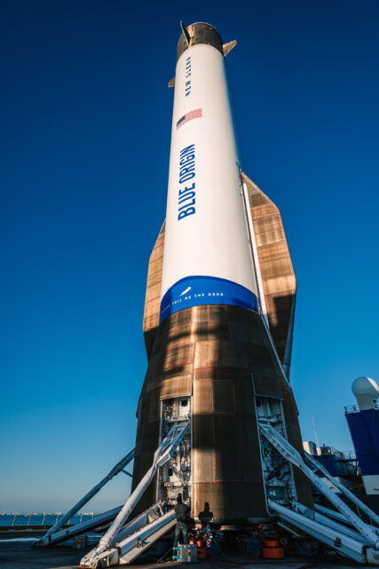 La primera etapa del New Glenn NG-2, ‘Never tell me the odds’ en la barcaza Jacklyn tras ser recuperada (Blue Origin).