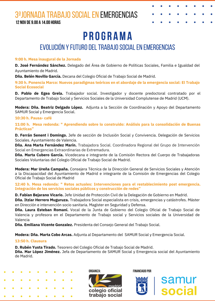El próximo 12 de diciembre, de 9:00 a 14:00 h, se celebrarán en la Sede del Área de Gobierno de Políticas Sociales, Familia e Igualdad las III Jornadas de Trabajo Social en Emergencias, organizadas conjuntamente por el Colegio Oficial de Trabajo Social de Madrid y la Dirección General de Políticas Sociales, Familia e Igualdad del Ayuntamiento de Madrid.