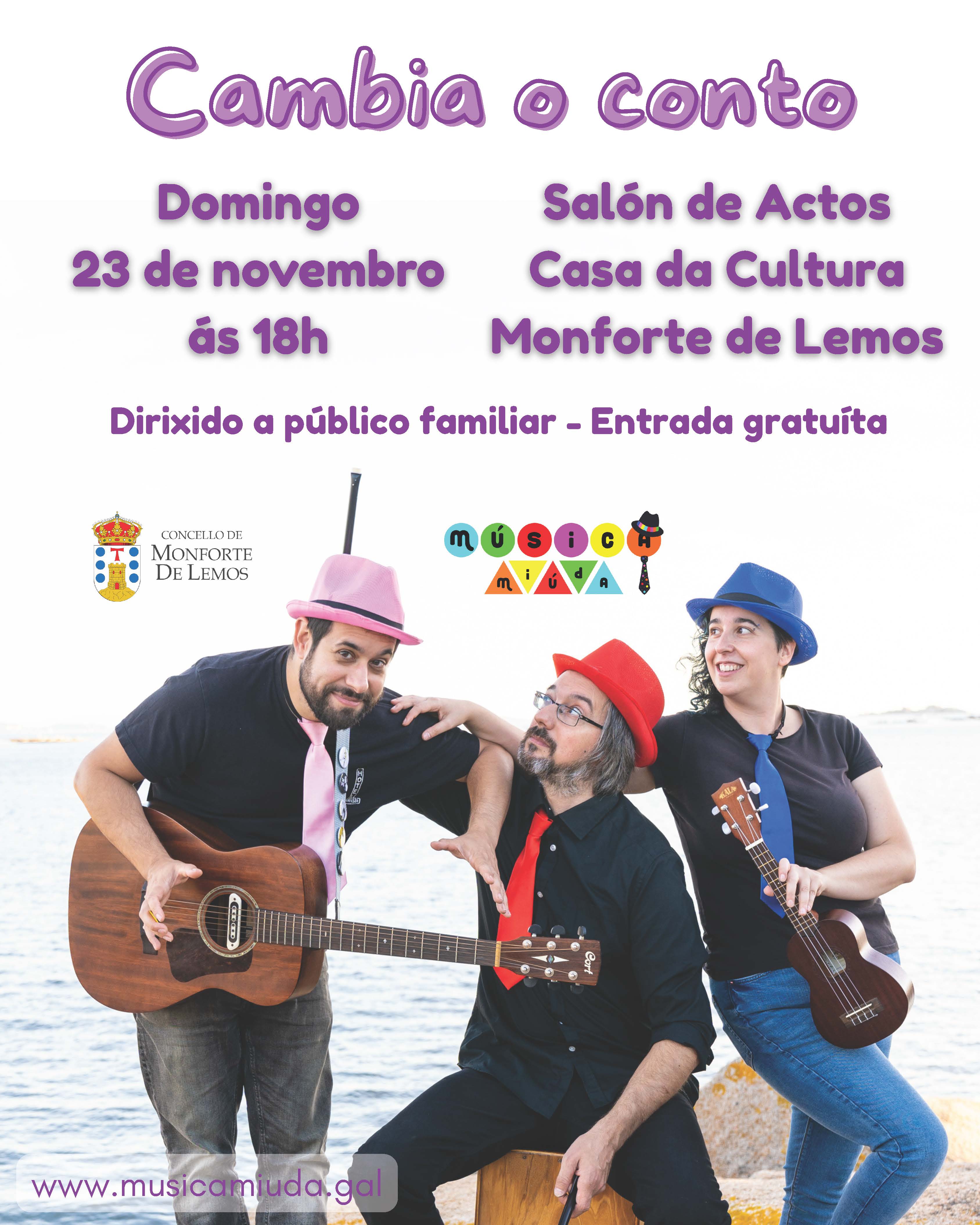 “Cambia o conto” es una propuesta cultural del trío Música Miúda, compuesto por Irene Quinteiro, Miguel Alonso y Óscar Martínez, que combina cuentos y canciones de creación propia que hacen especial hincapié en la diversidad y en la integración, todo ello con una perspectiva de género y de promoción de nuestra lengua. Sus espectáculos tienen un amplio recorrido por bibliotecas, centros educativos y auditorios de toda Galicia.