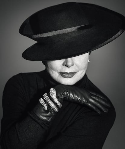 Isabella Rossellini lleva vestido de seda de GARAIZABAL y, debajo, vestido de punto de MARINA RINALDI; guantes de tul de GUANTE VARADÉ; pendientes Serpenti Pallini en oro rosa con ónix con ‘pavé’ de diamantes y reloj Serpenti Spiga de dos vueltas con caja y brazalete en oro rosa engastados con diamantes y esfera negra, ambos de BVLGARI.Nico Bustos