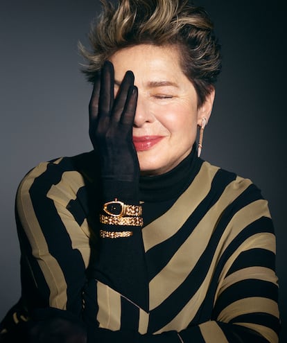 Para mí ser modelo es actuar. Como modelo también me invento un personaje. Como hoy, con las joyas y la ropa de esta sesión. Al final se trata de crear una emoción con el rostro de una persona. Como madre, además, siempre fue más fácil el trabajo de modelo que el de actriz. El proceso es más corto. Por eso lo adoro.