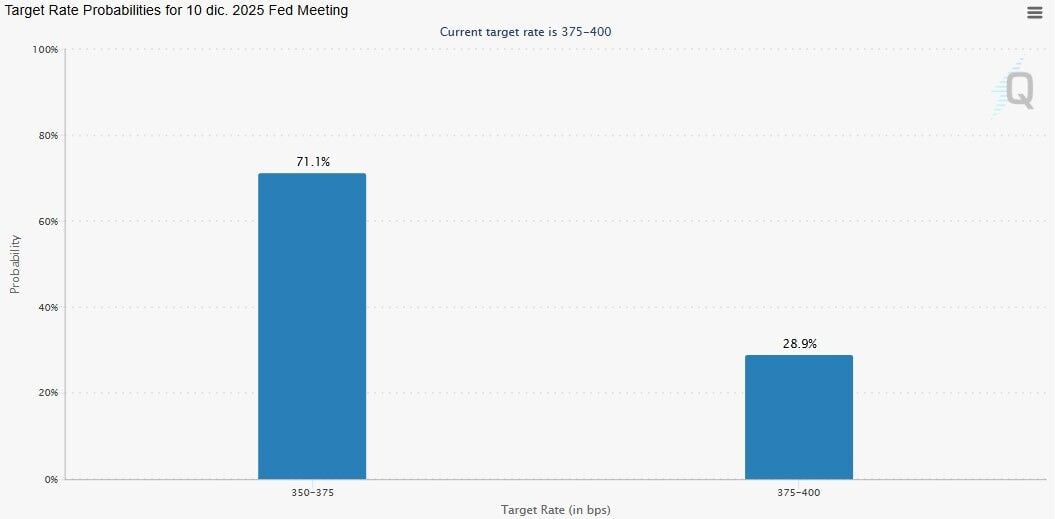 Tras estas declaraciones del influyente banquero central, las apuestas dan un vuelco y parecen dirigirse más hacia un recorte de tipos en diciembre. Según la herramienta Fedwatch de CME Group, los operadores ven ahora una probabilidad de un 71,1% a un recorte de 25 puntos porcentuales, mientras que la probabilidad a que los tipos se mantengan en su rango actual -3,75% al 4,00%-, es de un 28,9%.