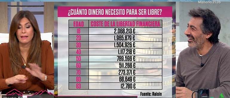 La conversación llegó este sábado a La Roca, en La Sexta, donde el matrimonio volvió a bromear sobre el famoso millón de euros. «Yo, con el premio, ya me puedo retirar», soltó Del Val después de comentar las cifras que, según un estudio, garantizarían la libertad financiera de los españoles. Y, con el plató ya entregado a la risa, el escritor aprovechó para lanzarle una pullita a su mujer: «¿Tú dónde dices que nos hemos gastado el premio?», le preguntó, mirando a la periodista.