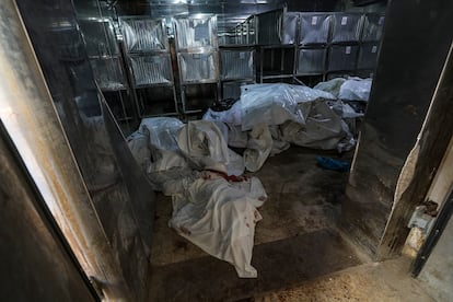 Los cuerpos de palestinos muertos en los ataques israelíes de este sábado sobre la Franja, en el depósito de cadáveres del hospital Al Shifa en Ciudad de Gaza.