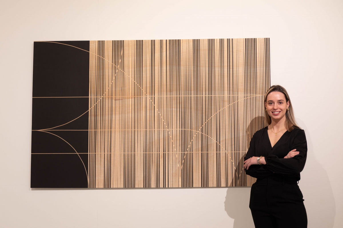 En esta ocasión despliega una serie de piezas que transforman esa pregunta clásica, ese huevo o gallina, en una reflexión visual sobre el origen y la secuencia, un trabajo con el que indaga en los fundamentos de la forma y del pensamiento geométrico. Aquí, el dilema entre causa y consecuencia se materializa en la línea, un ejercicio da pie a una obra cargada de ritmo. “Es un título que trata de acercar una obra pictórica y geométrica hacia un público más amplio, relacionando la línea geométrica y la línea natural. A nivel plástico, también mediante la proporción áurea, presente en la naturaleza”, señaló la artista durante la presentación.