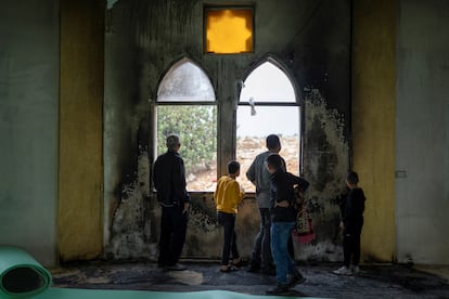 Palestinos miran antes del rezo del viernes las ventanas quemadas de una mezquita quemada por colonos en Salfit (Cisjordania), el pasado día 14.DPA vía Europa Press (DPA vía Europa Press)